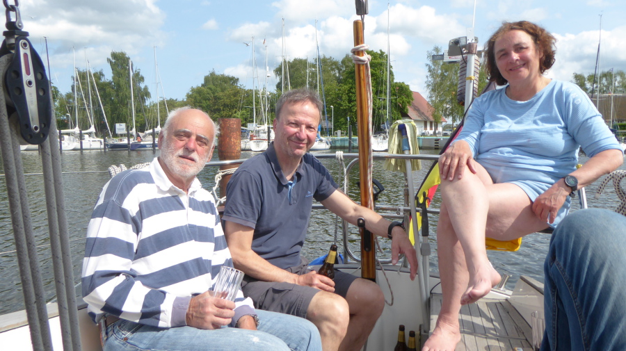 SY AVALON kam aus dem Winterlager in Ribnitz vorbei und die Mannschaft half mit Rat und Tat.